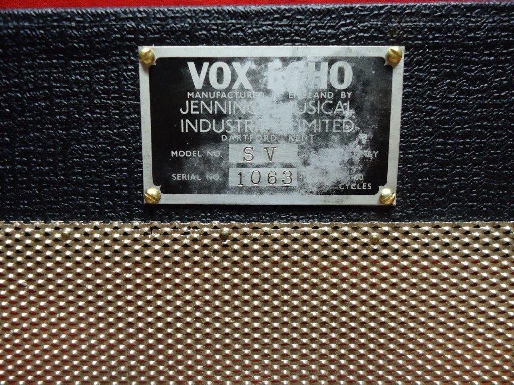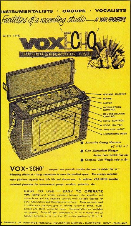 In 1962 werd wederom een Vox Echo/Reverberation Unit (Schema OS/011 – januari 1962) op de markt gebracht. Ditmaal van Britse makelij met op de eerste series ook weer de messingkleurige “voxECHO” badge. In feite was dit geen echo maar een verengalm (spring reverb). De Reverb tank was een van het Hammond concept afgeleide eigen JMI invulling geintegreerd in het chassis.