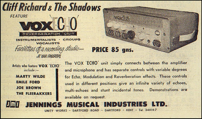Rond 1962 ontwikkelde JMI Engineer Doug McDonald in samenwerking met Dick Denney en anderen de eerste Britse Vox tape echo. Bij dit ontwerp werd dankbaar gebruik gemaakt van bestaande concepten van andere merken als Meazzi (PA serie) en Watkins (Copicat) tape echo’s.
