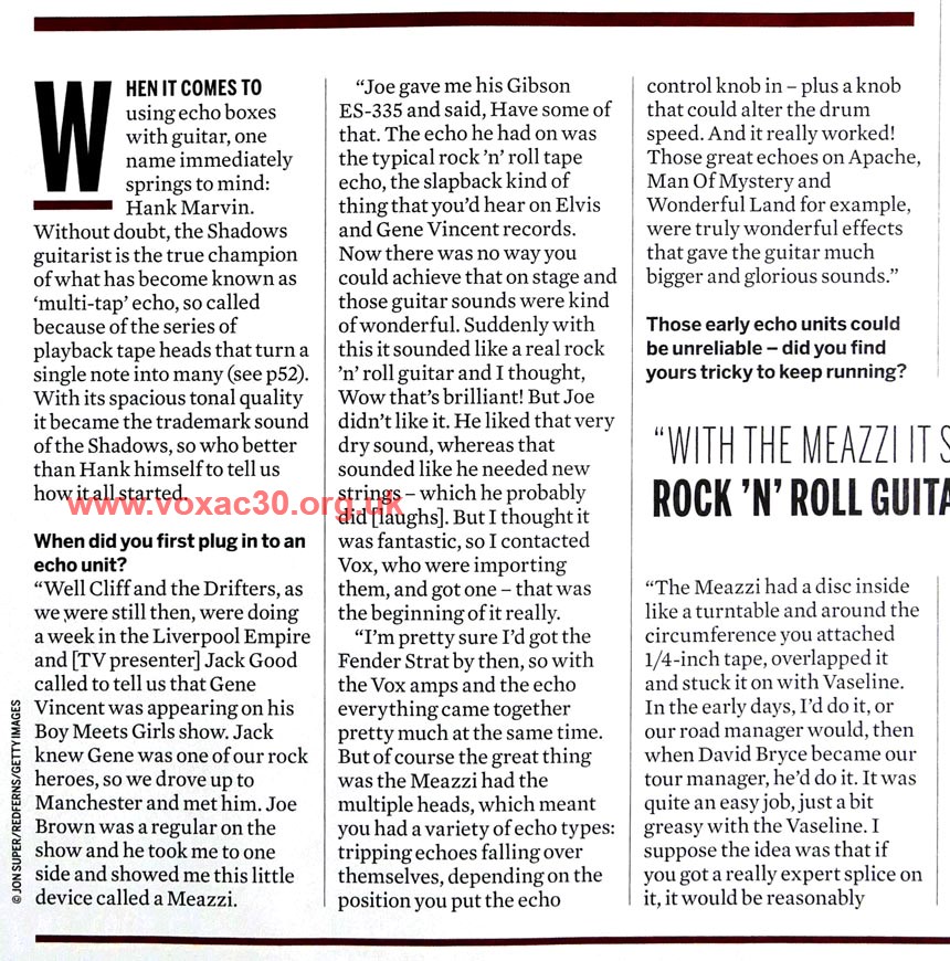 Dit artikel is tot stand gekomen in nauwe samenwerking met Professor Paul Rossiter van TVS Special Products -Australie (ontwikkelaar van Hank Marvin’s TVS 3 echo), alsmede met de informatie uit Alan Jackson’s artikelen in het Shadsfax Magazine (UK).